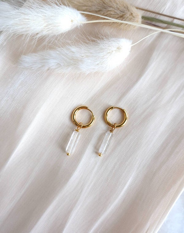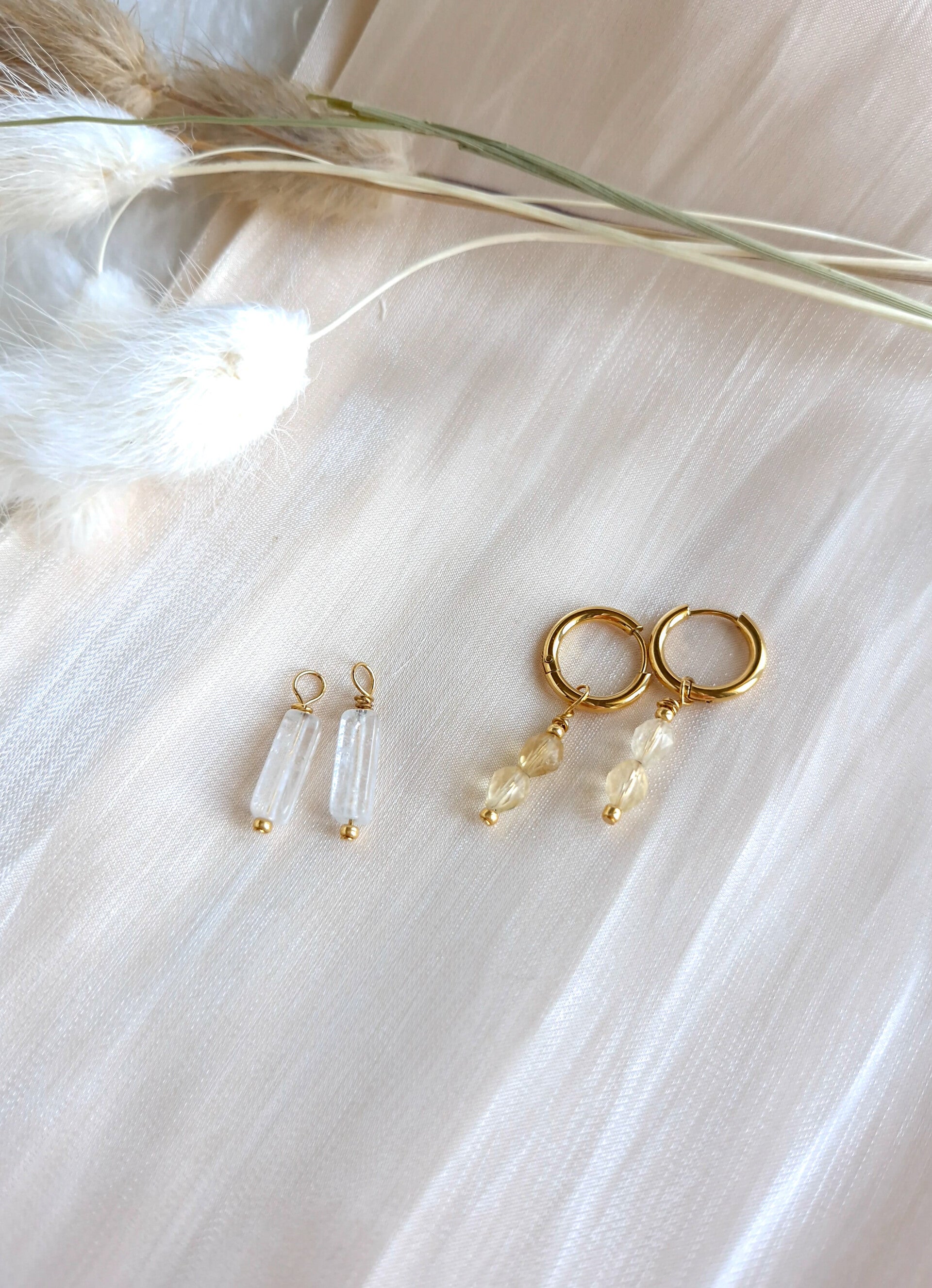 Boucles d’oreilles créoles élégantes, accompagnées de pendentifs en Cristal de Roche. Les pendentifs sont amovibles, vous permettant de personnaliser votre style et de varier les looks selon vos envies !