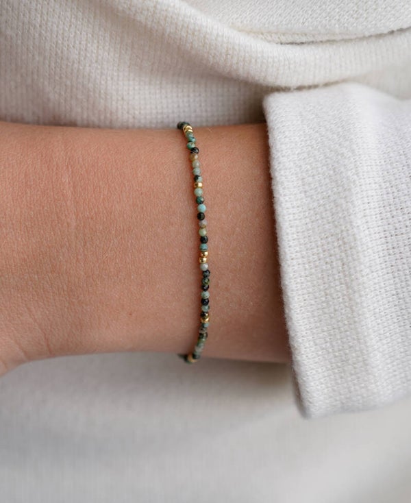 Bracelet fin orné de perles en turquoise africaine, avec une touche de luminosité des perles Miyuki dorées. Ce bijou s’harmonise parfaitement avec tous les styles, tout en apportant courage et confiance pour surmonter les peurs et avancer avec assurance.