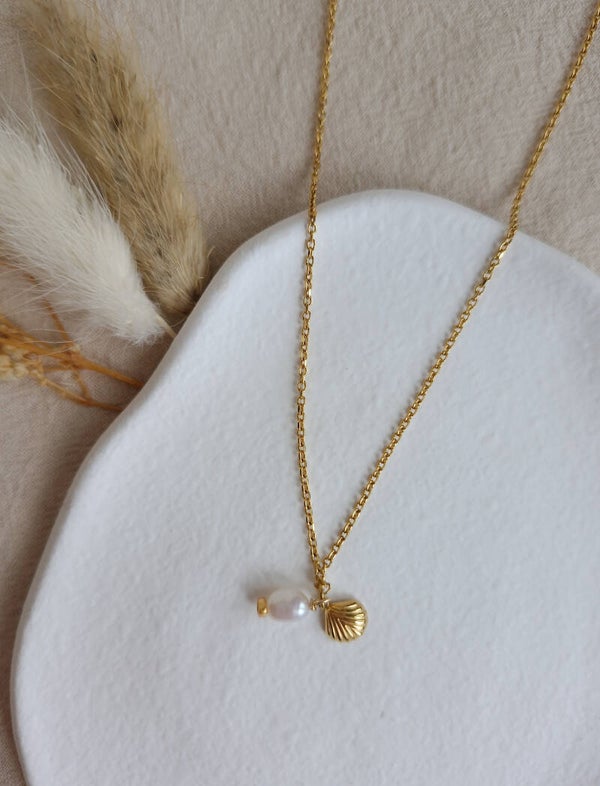 Ce collier élégant et intemporel habille une tenue avec simplicité. Avec son pendentif en forme de coquillage, ce collier nous transporte en vacances… au bord de la mer ou l'océan, les pieds dans le sable chaud à la recherche d'un coquillage.