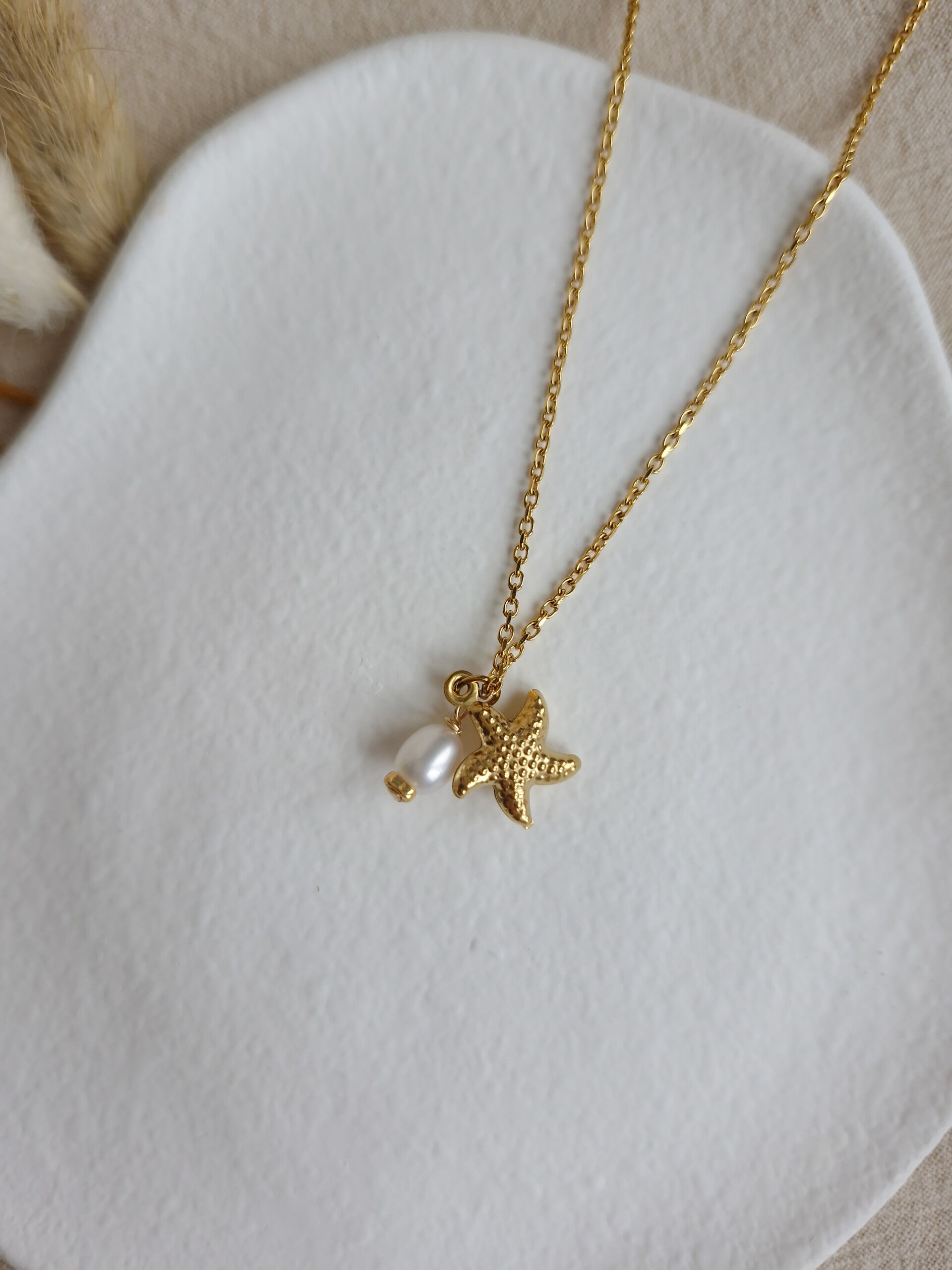 Ce collier élégant et intemporel habille une tenue avec simplicité. Avec son pendentif en forme d'étoile de mer, ce collier nous transporte en vacances… au bord de la mer ou l'océan, sur son linge de place avec un bon bouquin à la main.