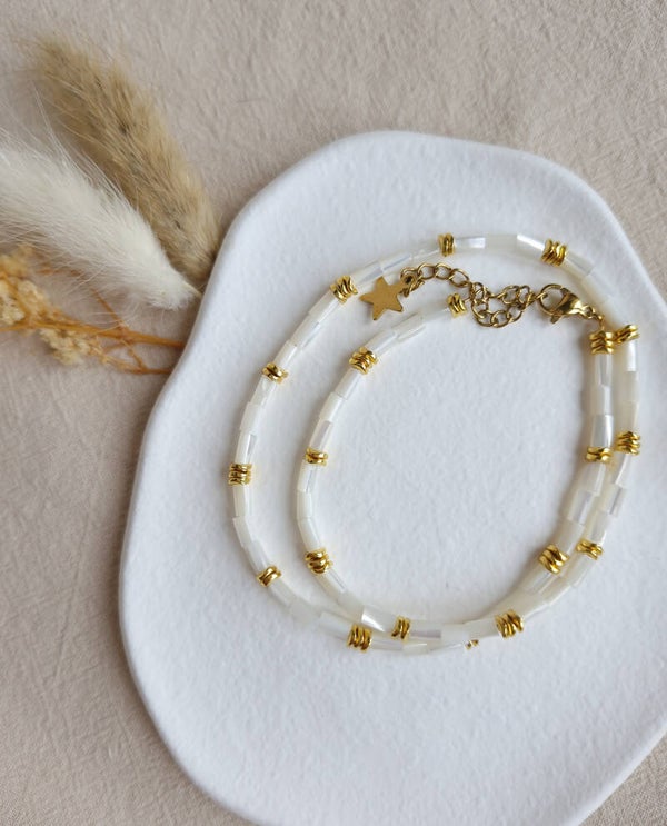 Collier en nacre et Hématite apporteront de la lumière douce et naturelle à vos tenues.