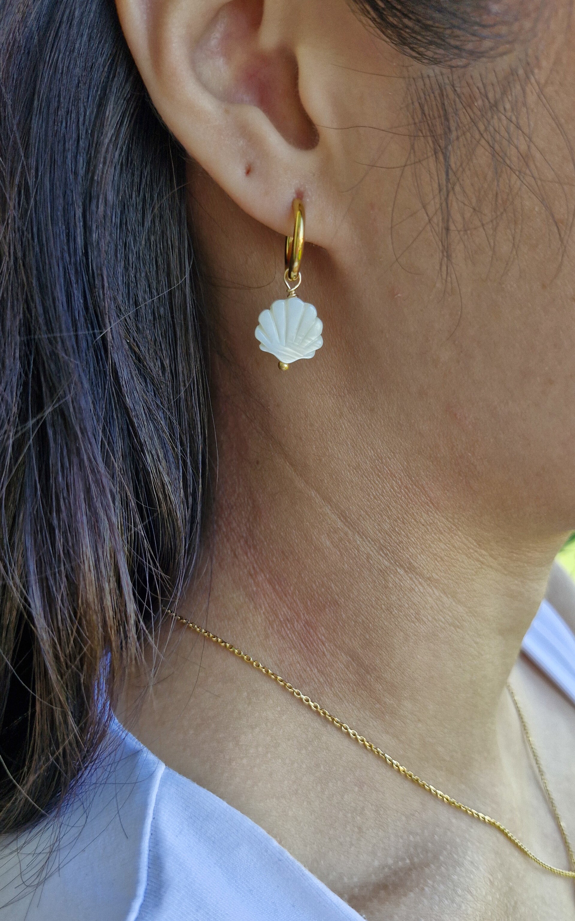 Boucles d'oreilles avec pendentifs en nacre en forme de coquillage. Ces boucles d'oreilles font partie de la collection "Besos del Sol - Sable Rose".
