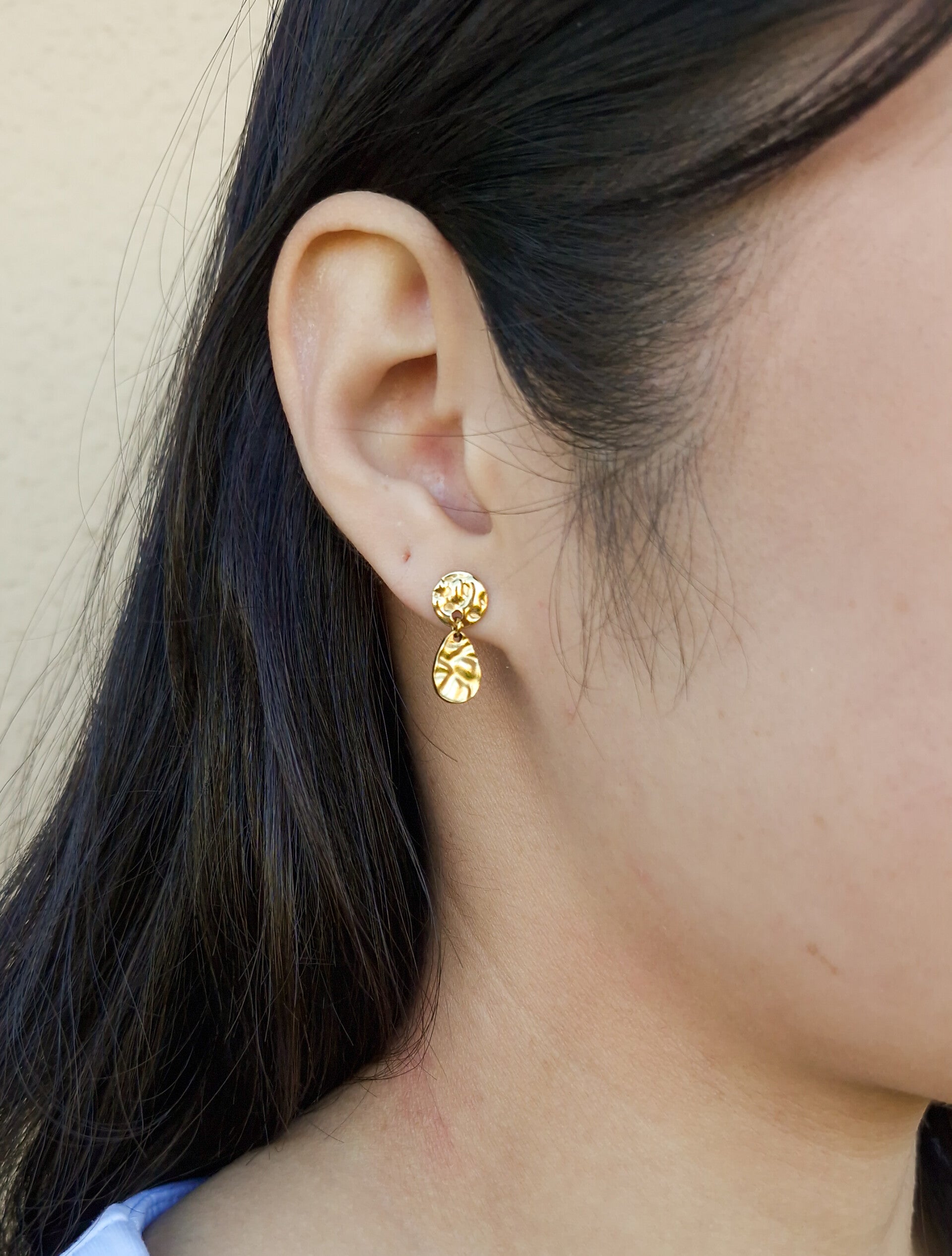 Boucles d'oreilles doré en acier inoxydable avec pendentif. L'effet martelée amène du caractère. Ses boucles d'oreilles discrètes et lumineuses vont parfaitement avec toutes les tenues.