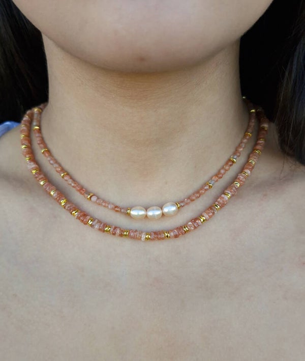 Le collier "Antonia" en Pierre de soleil, Hématite et 3 perles d'eau douce, apporte de la fraicheur dans votre tenue, parfait pour faire face aux changements dans votre vie !